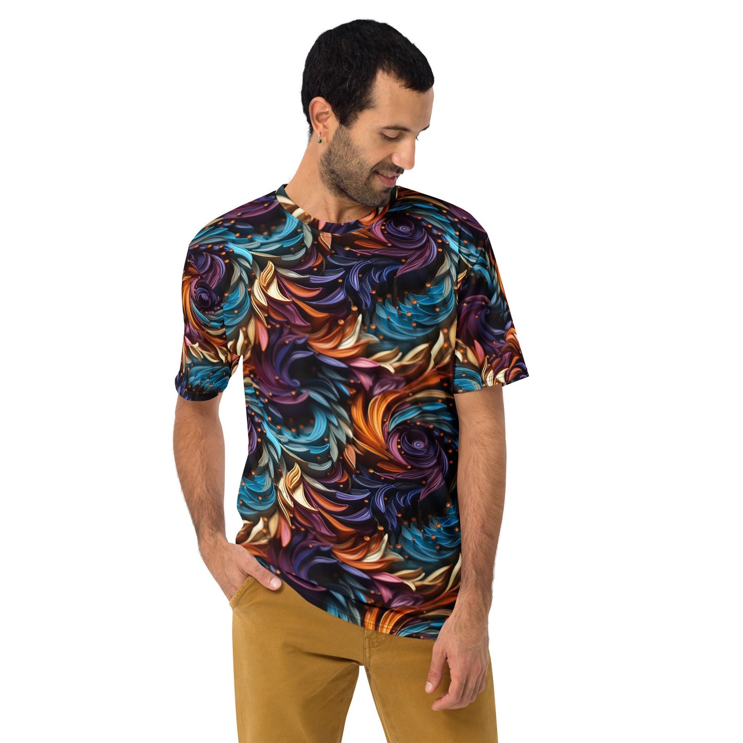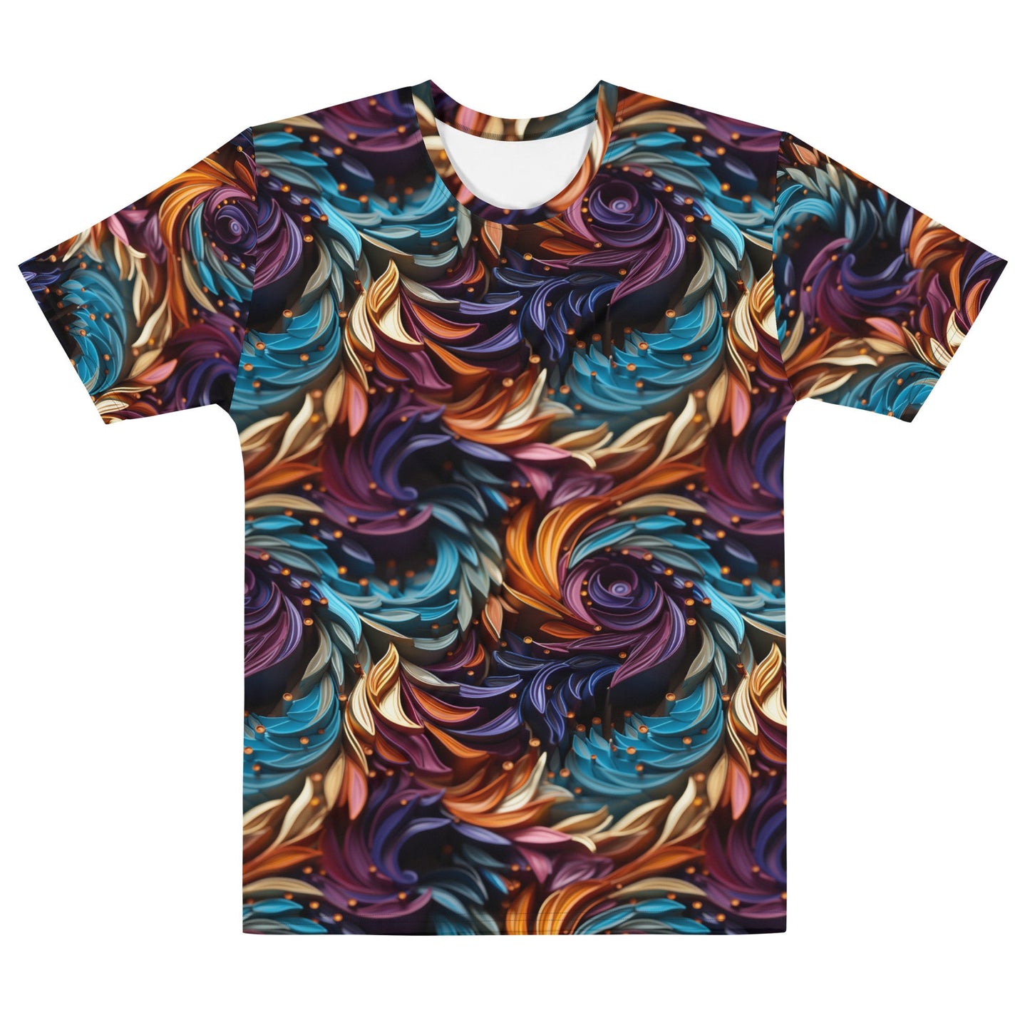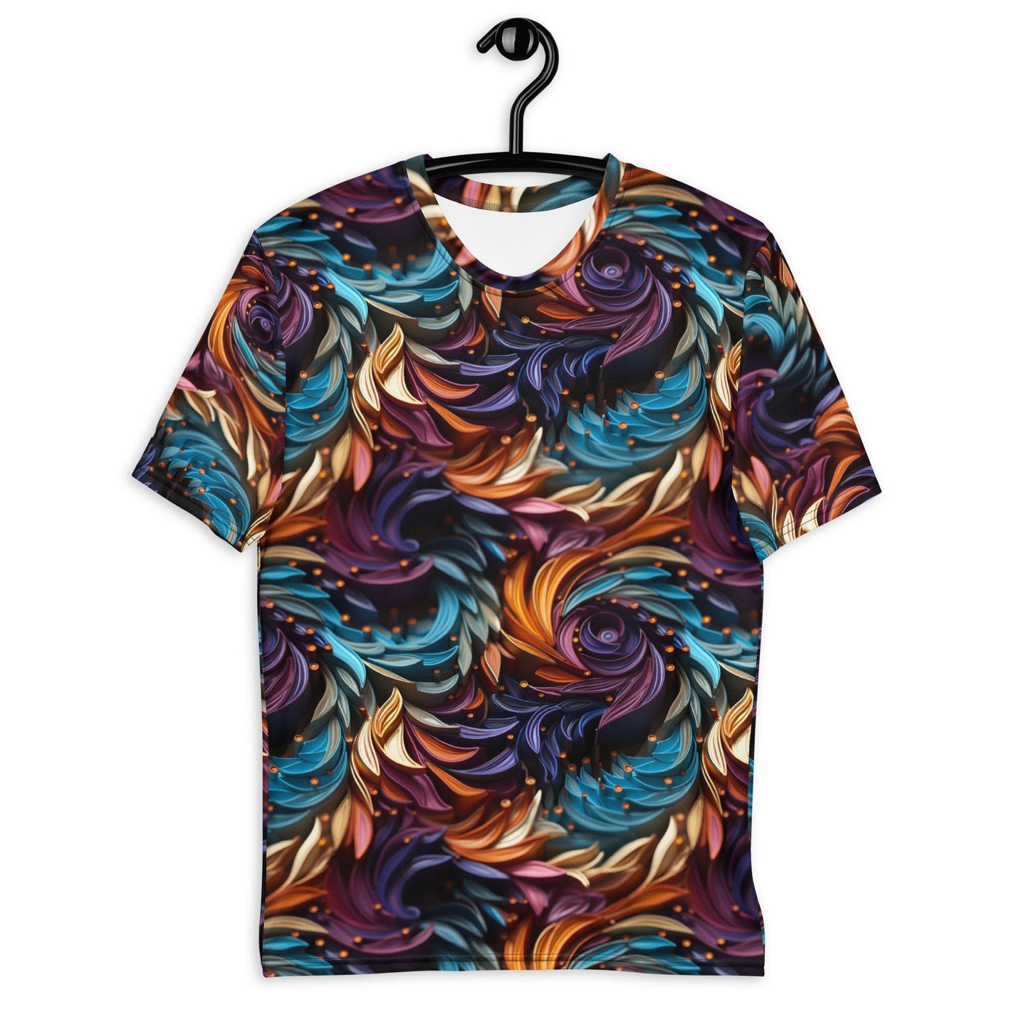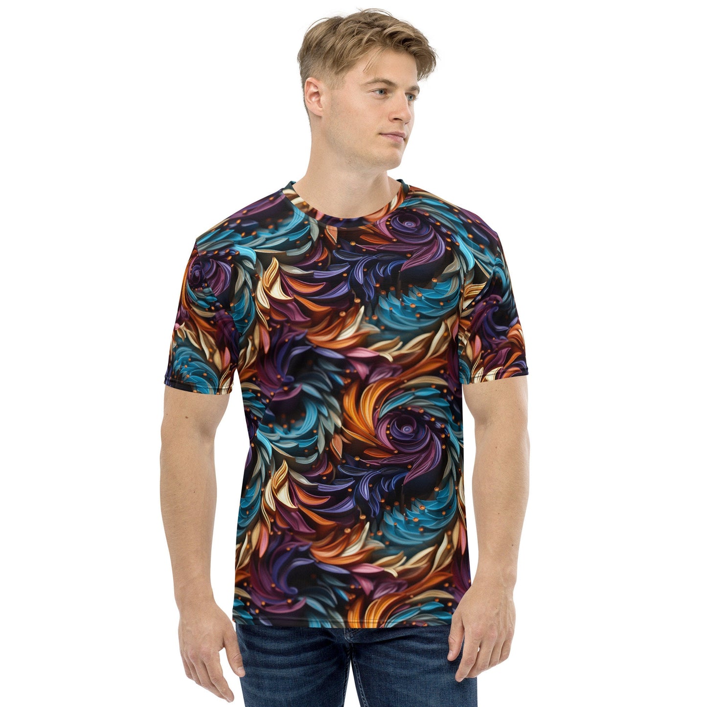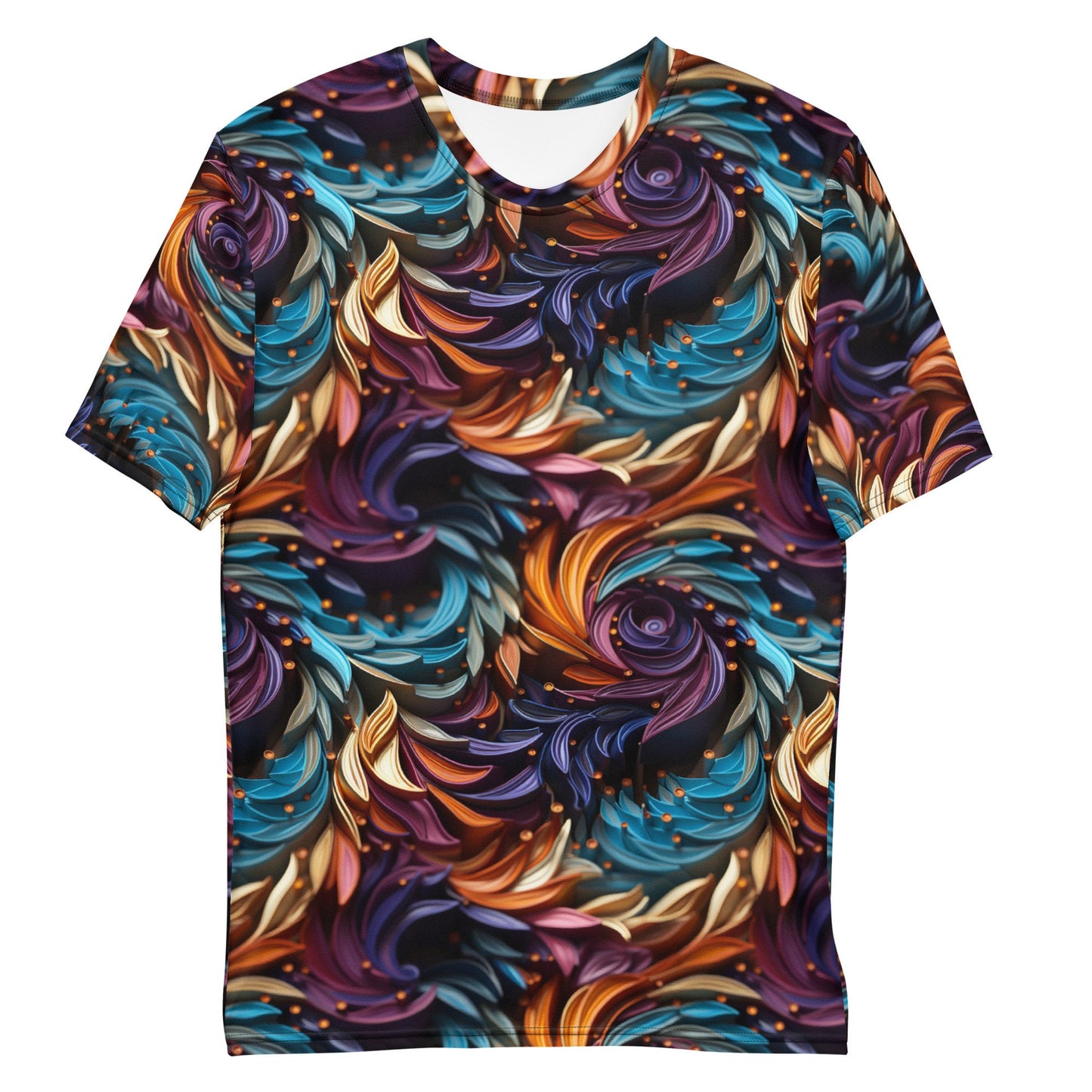 Unleash your unique style with our Men's Mesmerizing 3D Swirl T-Shirt. This shirt is a fantastic way to stand out from the crowd and showcase your love for vibrant and striking designs. The 3D swirl in a multicolored palette of purple, gold, and teal creates a hypnotizing spiral illusion that will draw you in and challenge your depth perception.